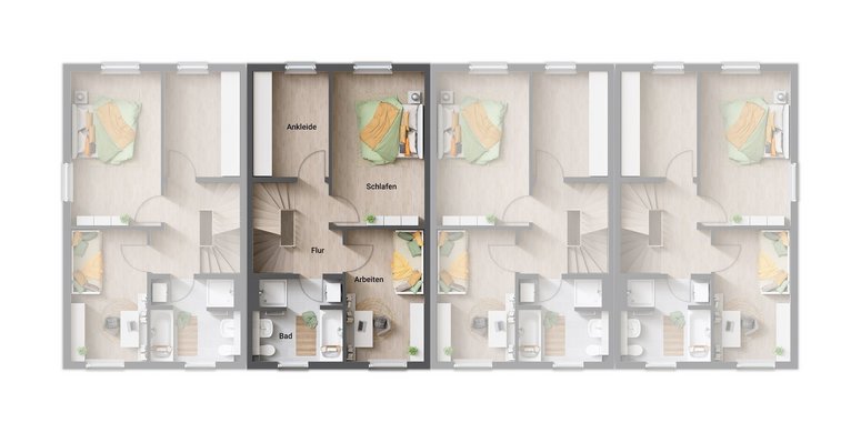Das Reihenhaus Mainz 128 bietet Ihnen die ideale Kombination aus modernem Wohnen und effizienter Flächennutzung. Mit vier Wohneinheiten entsteht ein attraktives Zuhause, das zugleich Raum für Individualität und Gemeinschaft schafft. Jede Einheit verfügt über rund 140 Quadratmeter Wohnfläche, verteilt auf drei Etagen mit einem großzügigen Wohn- und Essbereich im Erdgeschoss, komfortablen Schlaf- und Kinderzimmern im Obergeschoss sowie einem vielseitig nutzbaren Studio im Dachgeschoss.